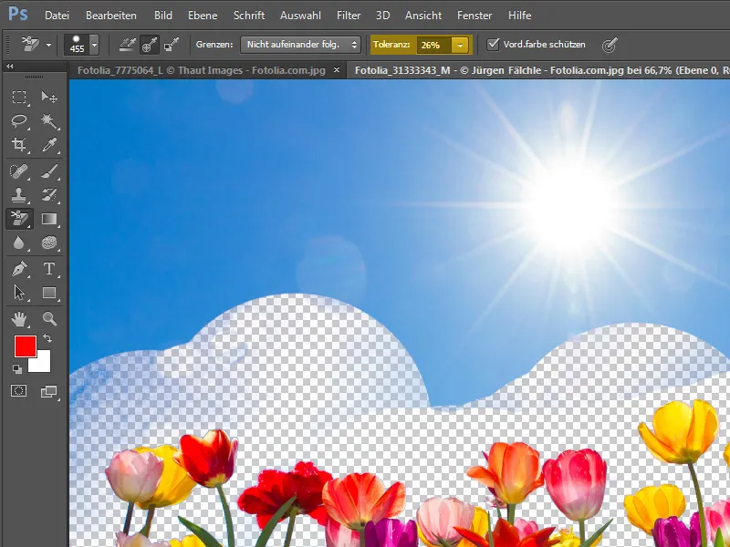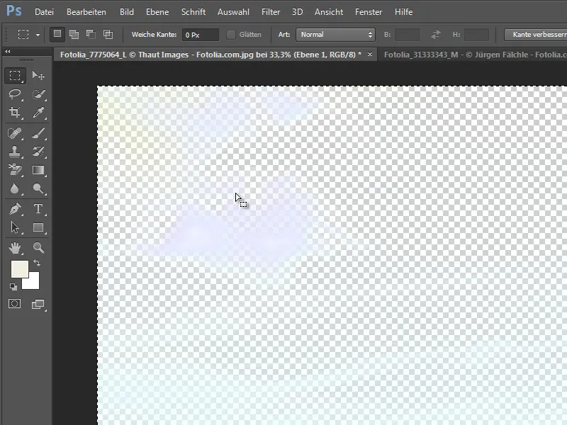 With a lower tolerance value, the clipping would not work as cleanly. For comparison, I temporarily reduced this value to 20 percent and used it to erase the background. You can clearly see the blue fringes at the edges of the clouds.