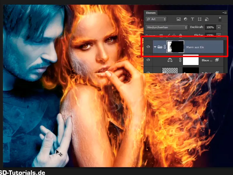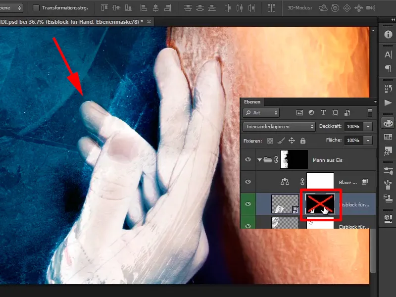 Now you're going to make two quick corrections, namely you're going to correct the finger, i.e. you're going to fix these shadows or these missing frost areas. This is because you created these contours at the very beginning of the tutorial and they were a bit outside of the finger and therefore didn't work with this mask.