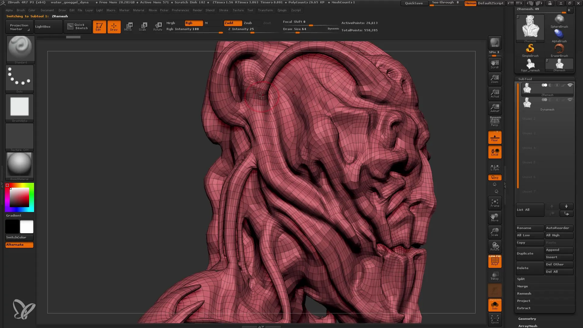Once ZRemesher has finished its work, you should check the polygon count. In this case, we are now at about 26,000 polygons with no significant loss of detail. You can compare the results and be amazed at how well the shapes have been maintained while drastically reducing the polygon count.