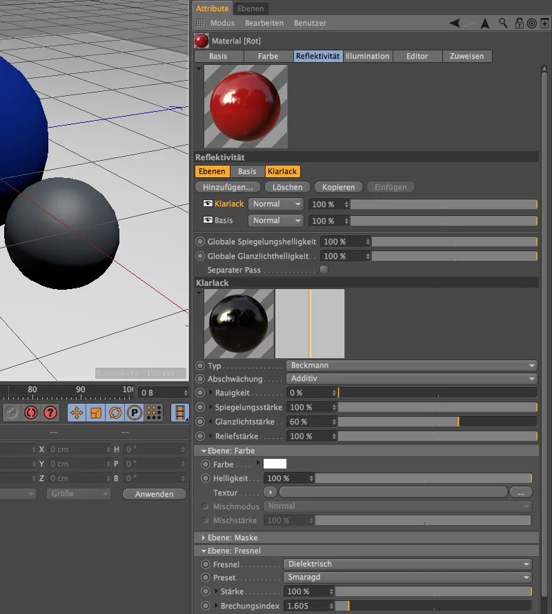 Finally, we give the sphere a special look by adding an additional layer with clear varnish. As you can see from the buttons above the layers, you can easily copy layers and paste them elsewhere. We can continue to use the clear varnish layer from the first example here. In contrast to this, however, we select the Diamond preset with an even stronger refractive index under Layer: Fresnel.