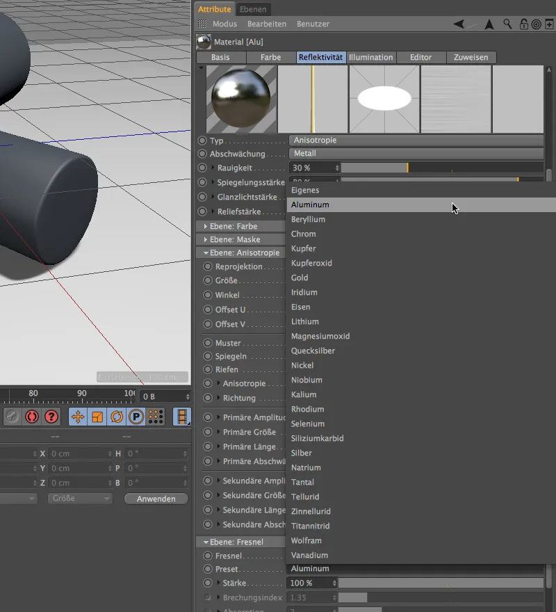 To get to know the difference between the anisotropies and presets better, we create a copy of the aluminum material using the Material Manager and try our hand at the precious metal gold.