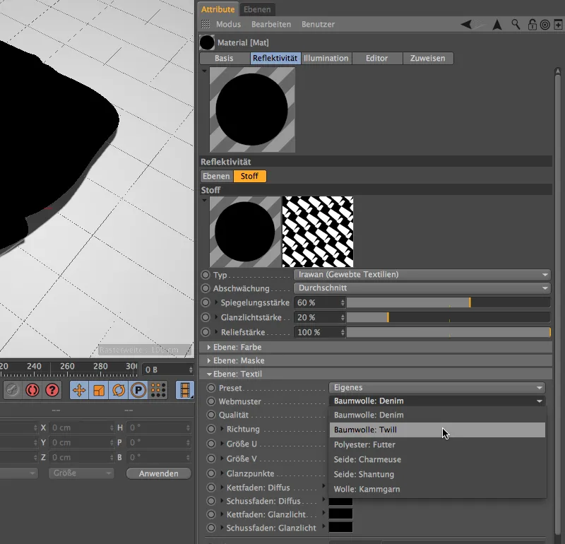 The color (diffuse) and the highlight of the fabric can be defined in color fields for warp and weft. There are many more customization options, but the parameters covered so far are sufficient for our introduction.