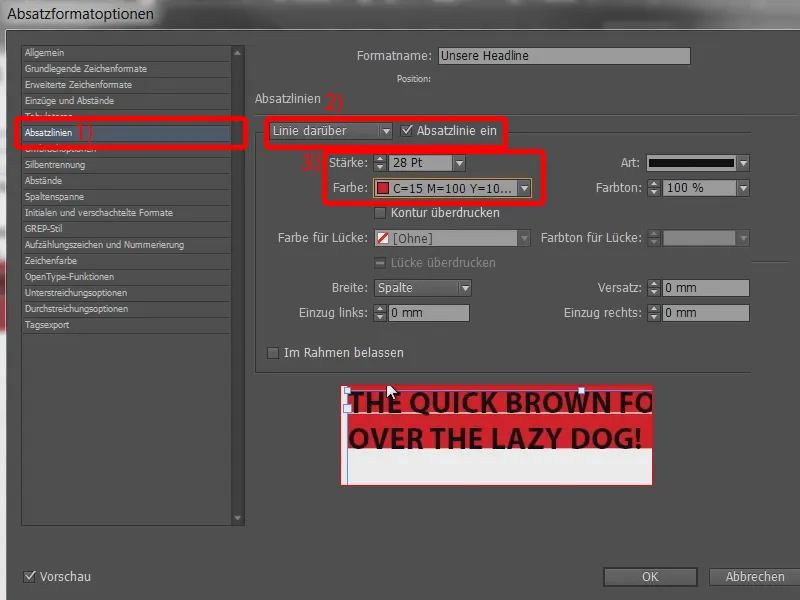 And now we come to the really exciting part, namely the paragraph lines (1): These are lines that are drawn horizontally through the paragraph. You can define lines above or below them. I activate the line above using this checkbox (2) and enter a thickness of 28 pt (3). It's all black now, so let's quickly change the color to red.