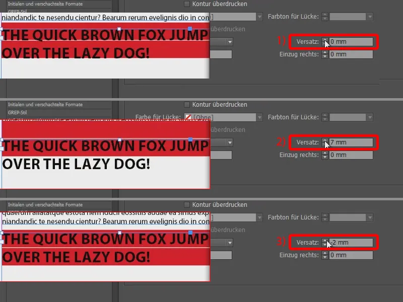 Now, of course, we want to have a small indent here (1), because the aim is to have a bit of flesh around the letters. So we simply add -3 mm to the indent on the left (2) and the same for the indent on the right (3). And then I'll just confirm the whole thing so that you can see what it looks like in total.