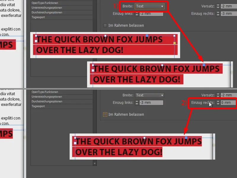 So what setting do we need to make? It's simple: you don't select the column for the width of the line above, but the text (1). And now we have exactly this result: the length of the red line is based on the written text.