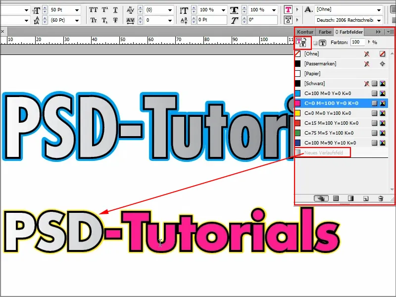 Or, as you can see in the example above, I could insert a gradient. To do this, I select the text (here: "PSD"), go to Color fields and click on New gradient field. I then have a small gradient in it.