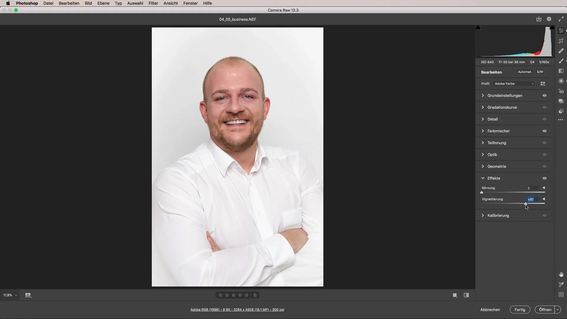 When editing your business portrait with Camera Raw, you should primarily pay attention to a natural look. The white balance, color correction, and gentle retouching of teeth and skin are crucial for a successful result.