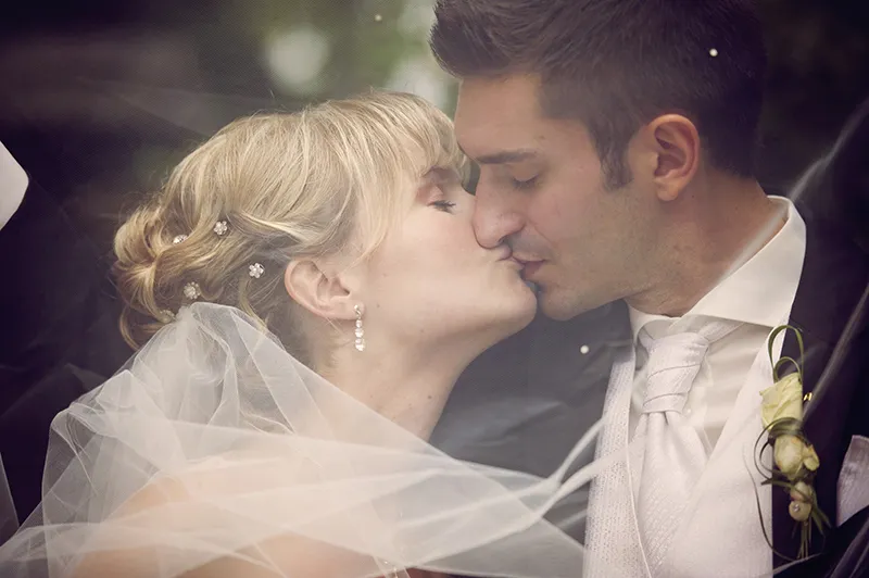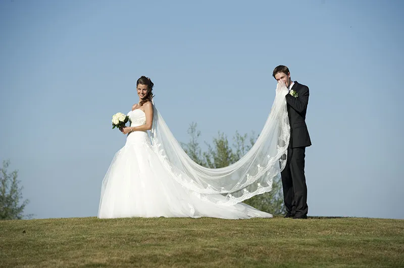 I also like to use a bit of excitement in the foreground. It's a matter of taste how much it can be. Also use backlighting so that the pictures are not always staged in the same way. Water reflections of the bride and groom also look great. By the way: This picture here is also available in a reversed version. The foreground is in focus, the bride and groom out of focus. Just play around a bit.