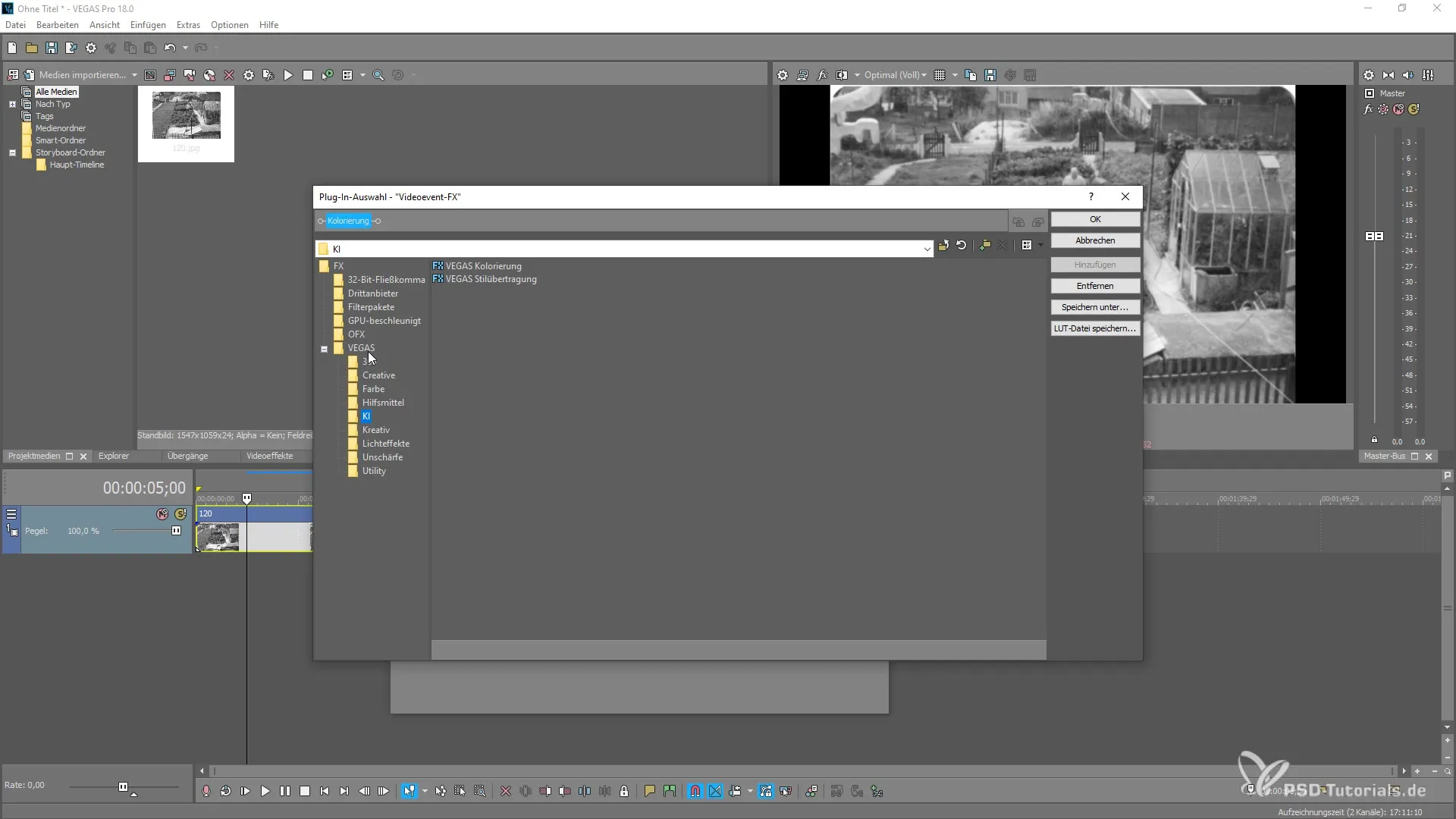 After you've chosen your image, you need to add the coloring. In the plugin chain of MAGIX VEGAS Pro 18, you can search for and use the appropriate effect. Go to Video FX and look for the coloring option under the AI effects.