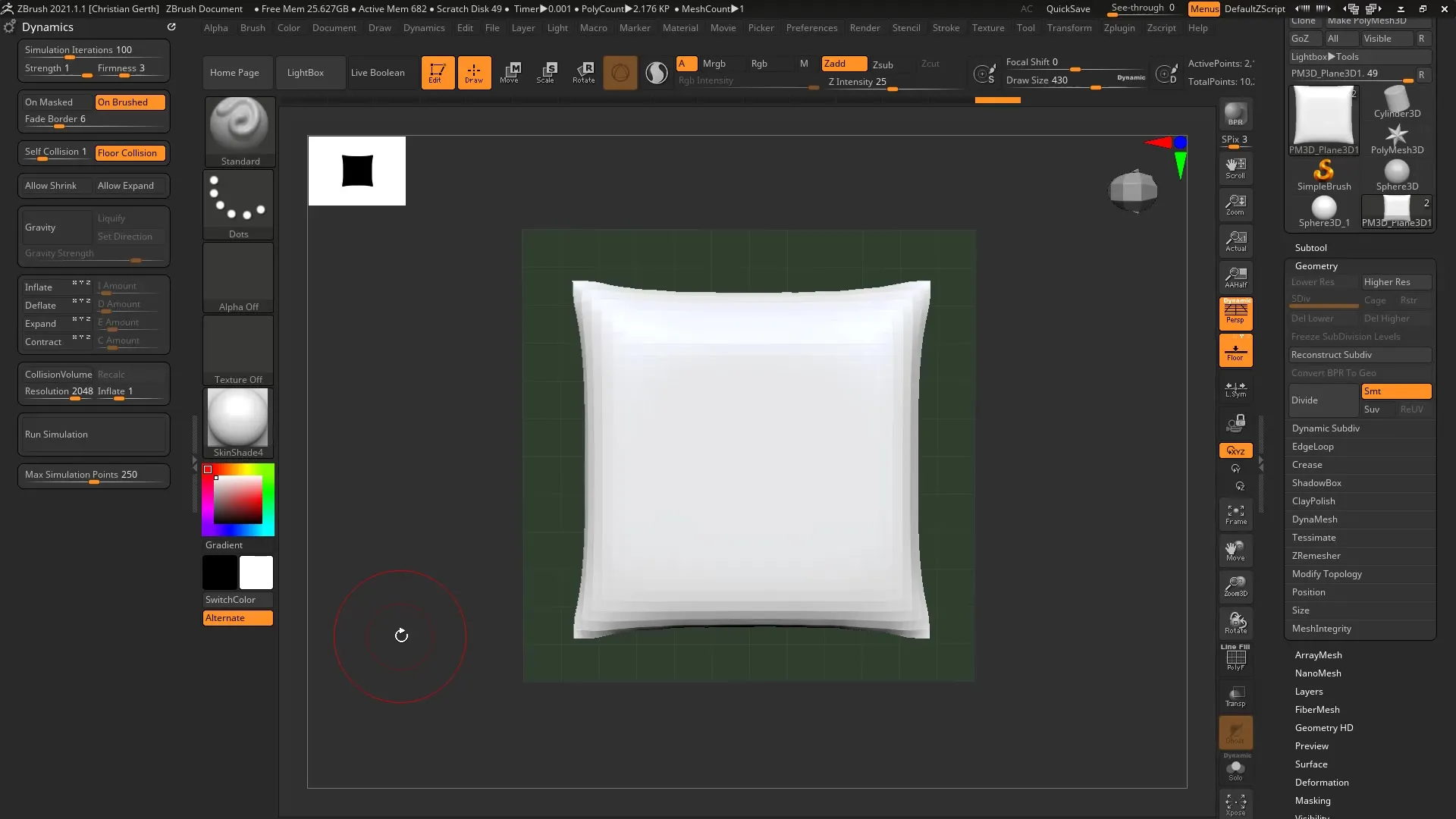 For this tutorial, we will use a simple pillow model that you created earlier. Select the pillow and choose a suitable Cloth Brush. I prefer the “Hook Brush.” Begin to work on your model.