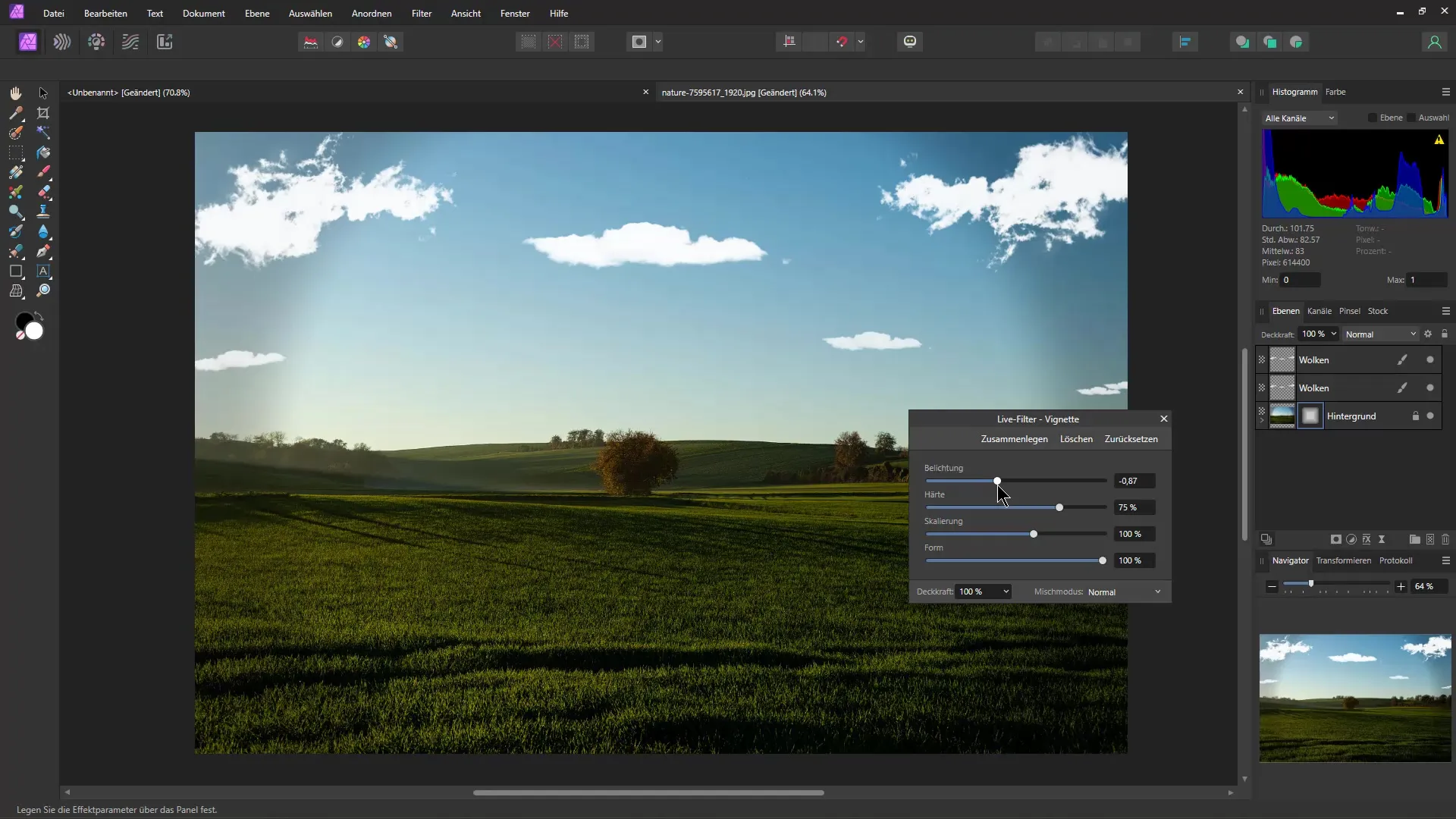 A vignette can help to direct focus to the main subject. To add a vignette in Affinity Photo, activate the "Vignette" filter.