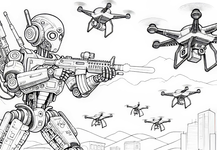 Robot lucha contra drones que atacan una ciudad: plantilla para colorear para descargar (gratis)