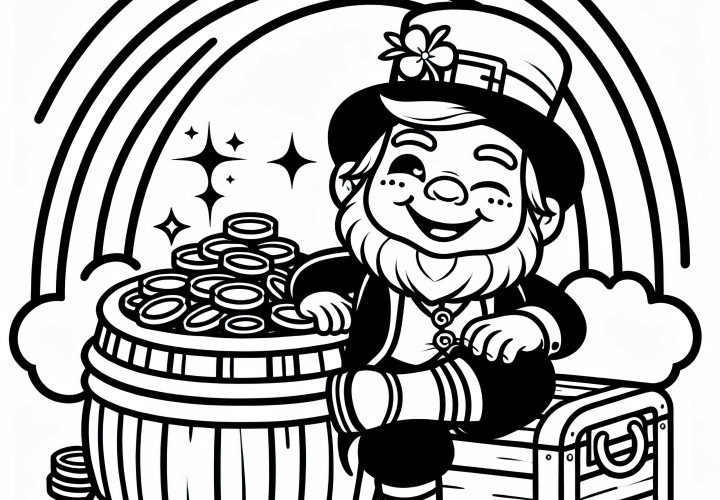 Un travieso duende se sienta sobre un cofre lleno de monedas de oro y sonríe de manera pícara: dibujo para colorear gratis