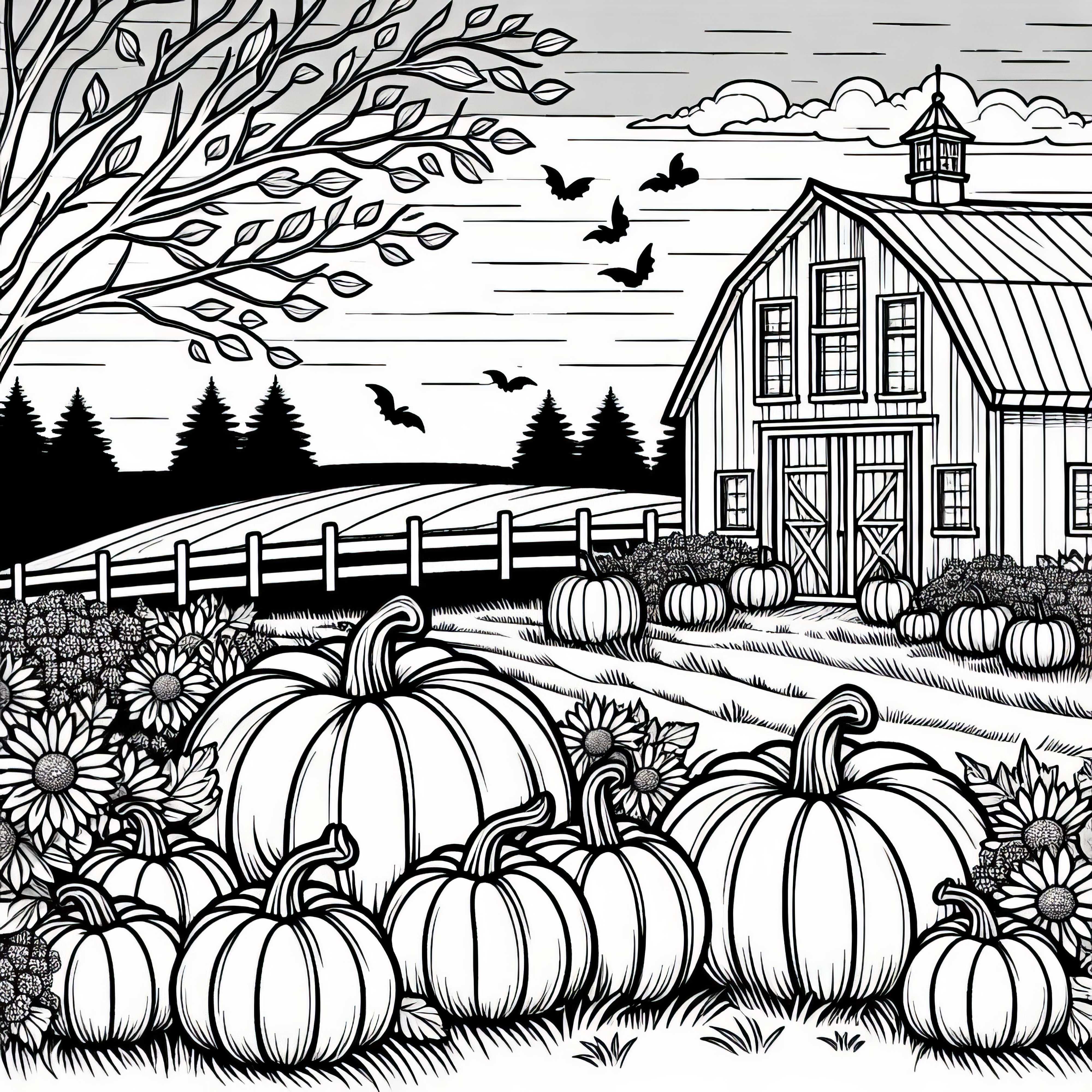Carro de cosecha lleno de maíz, calabazas y saco de patatas frente a la granja - Plantilla para colorear de otoño gratis