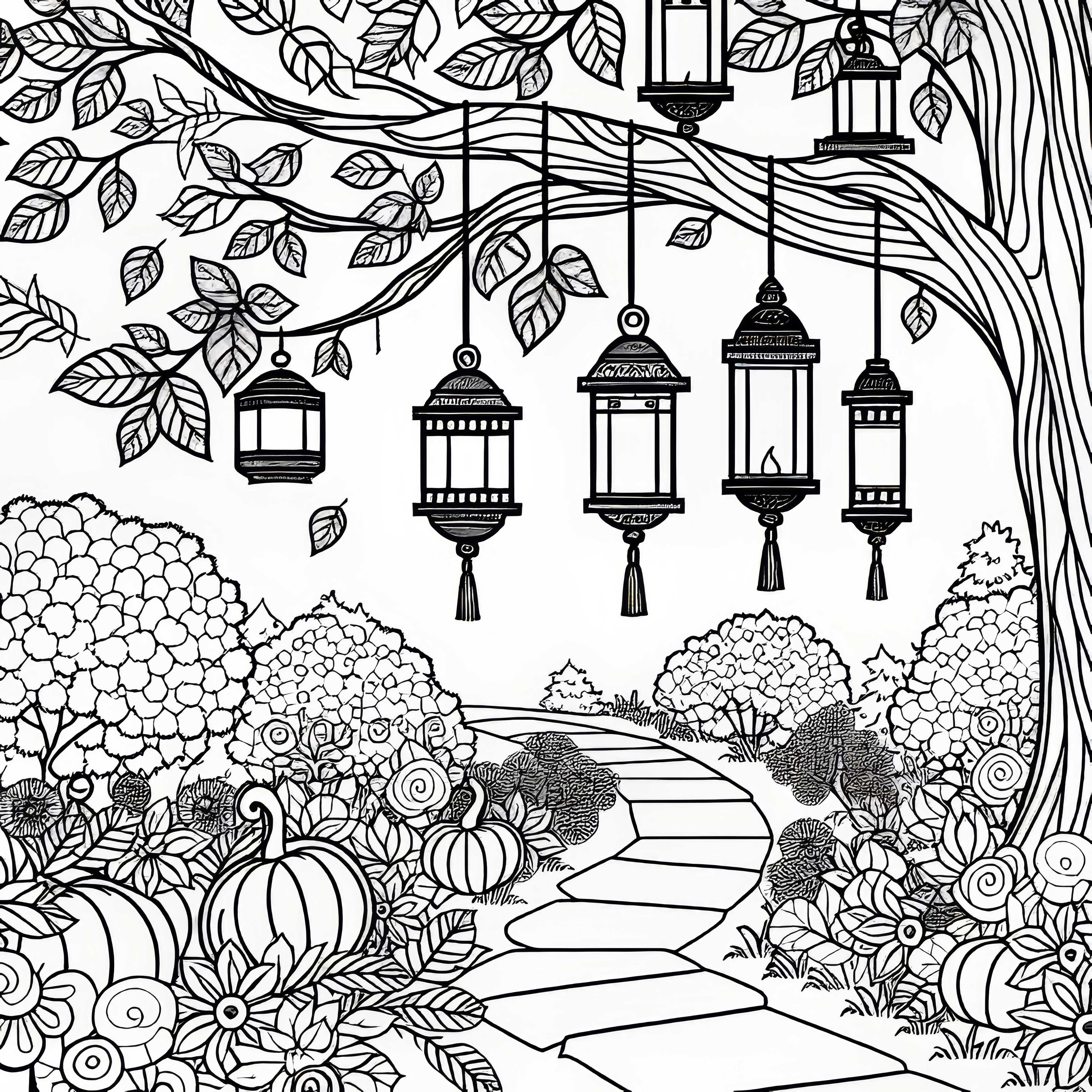Lámparas cuelgan de los árboles sobre el camino del jardín - plantilla para colorear de otoño gratis