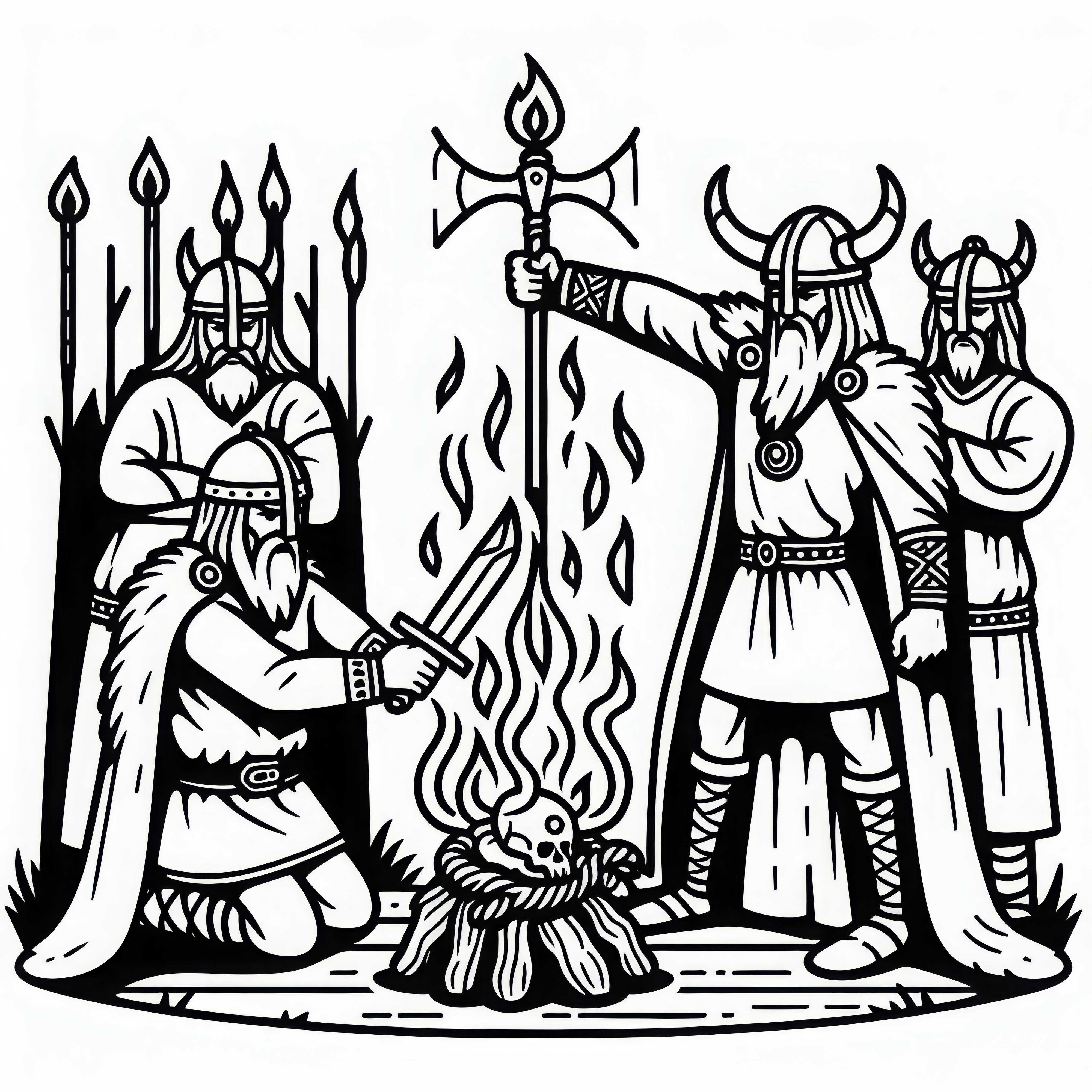 Vikingos que ofrecen sacrificios a Odín antes de la batalla - Plantilla para colorear de la mitología nórdica gratuita