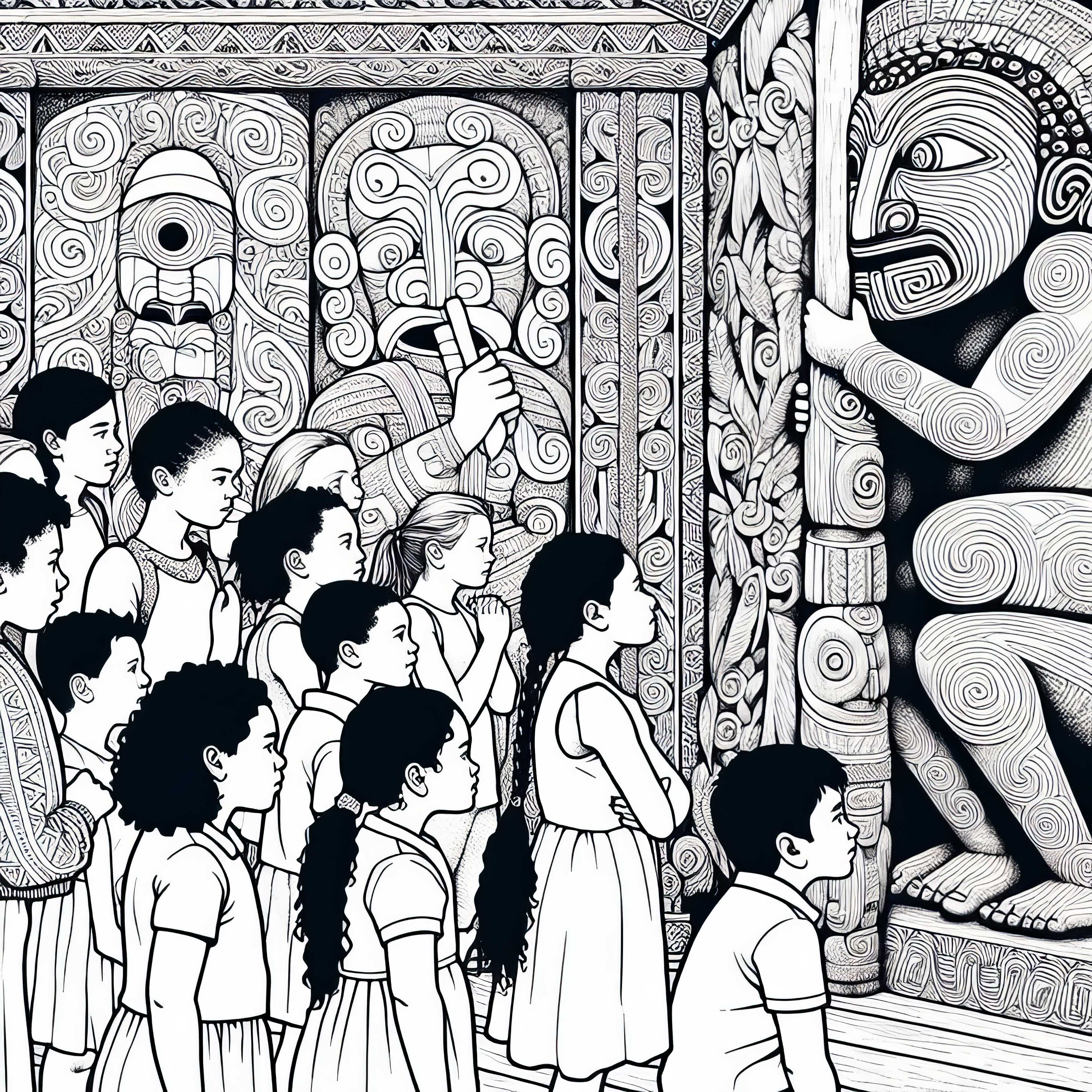 Tallados maoríes de Nueva Zelanda con niños observando - plantilla para colorear gratis de Australia y Oceanía