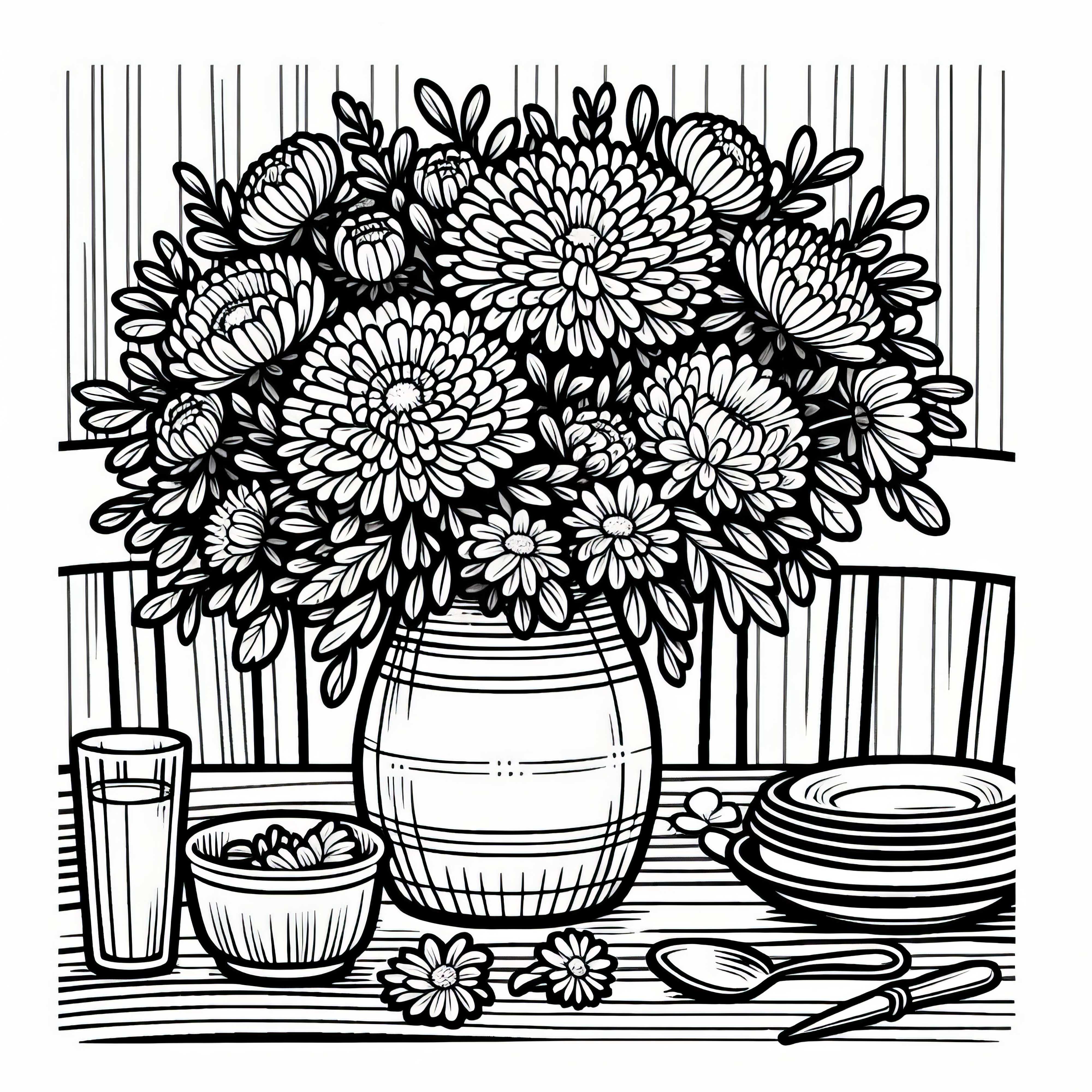 Imagen para colorear: Ramo de flores, asters en jarrón sobre mesa