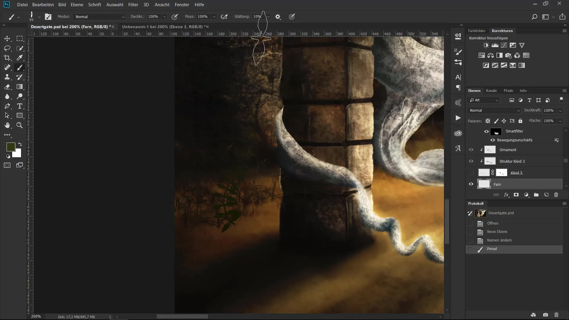 Ahora puedes utilizar la técnica aprendida para insertar vegetación exuberante en tu obra. Tus pinceles de helecho están siempre a tu disposición para que puedas trabajar creativamente.