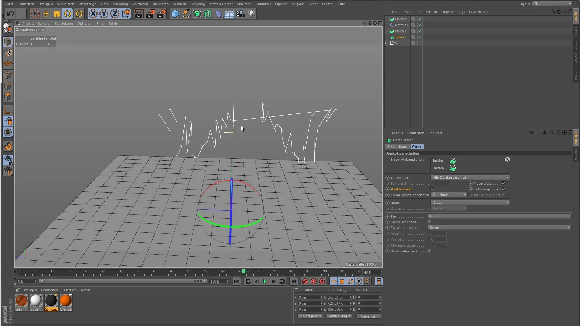 Para ampliar las posibilidades del Tracer, prueba también un sistema de partículas. Aquí utilizamos un emisor simple que genera partículas. Víncula el emisor con el objeto Tracer y observa cómo las partículas también aparecen en forma de Splines.