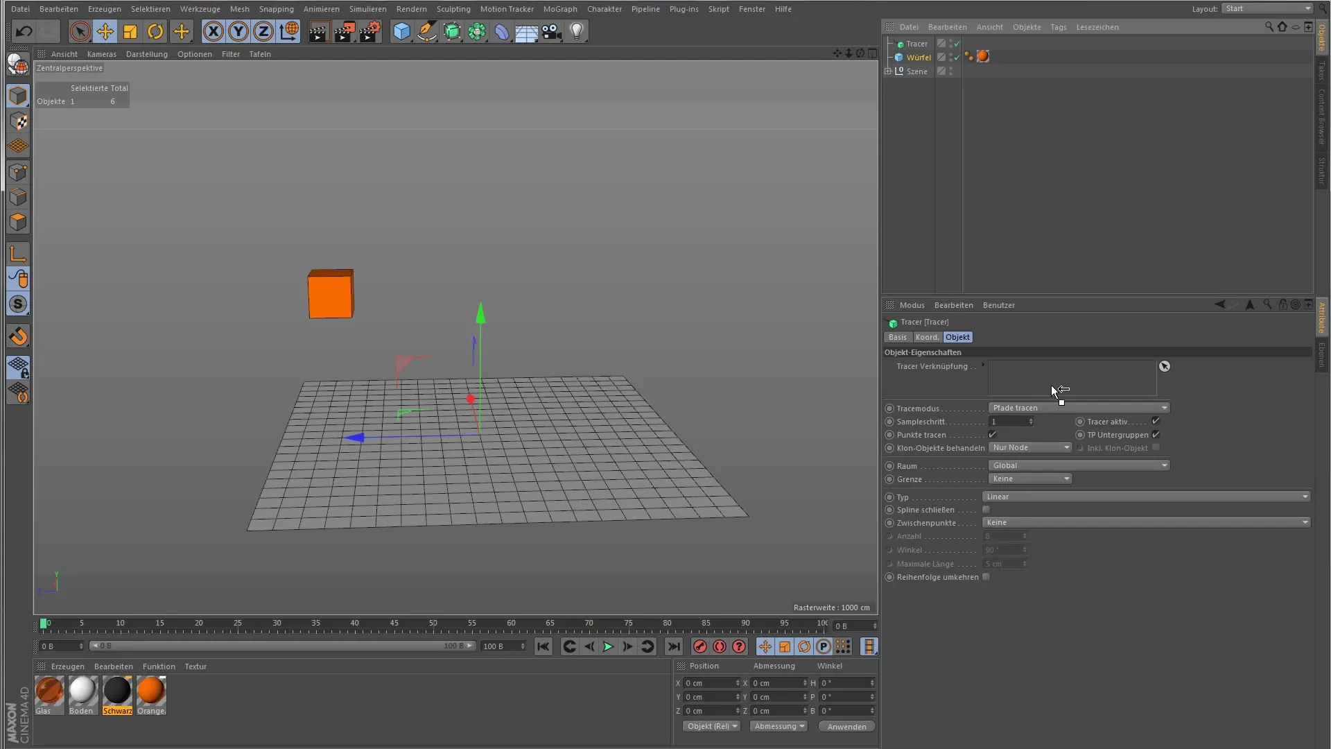 Inicia Cinema 4D y abre un nuevo proyecto. Aquí crearé una simple animación para presentarte el objeto Tracer. Ya he animado un cubo que vuela de izquierda a derecha y gira al mismo tiempo. Para utilizar el Tracer, debes insertar este objeto en el objeto Tracer.