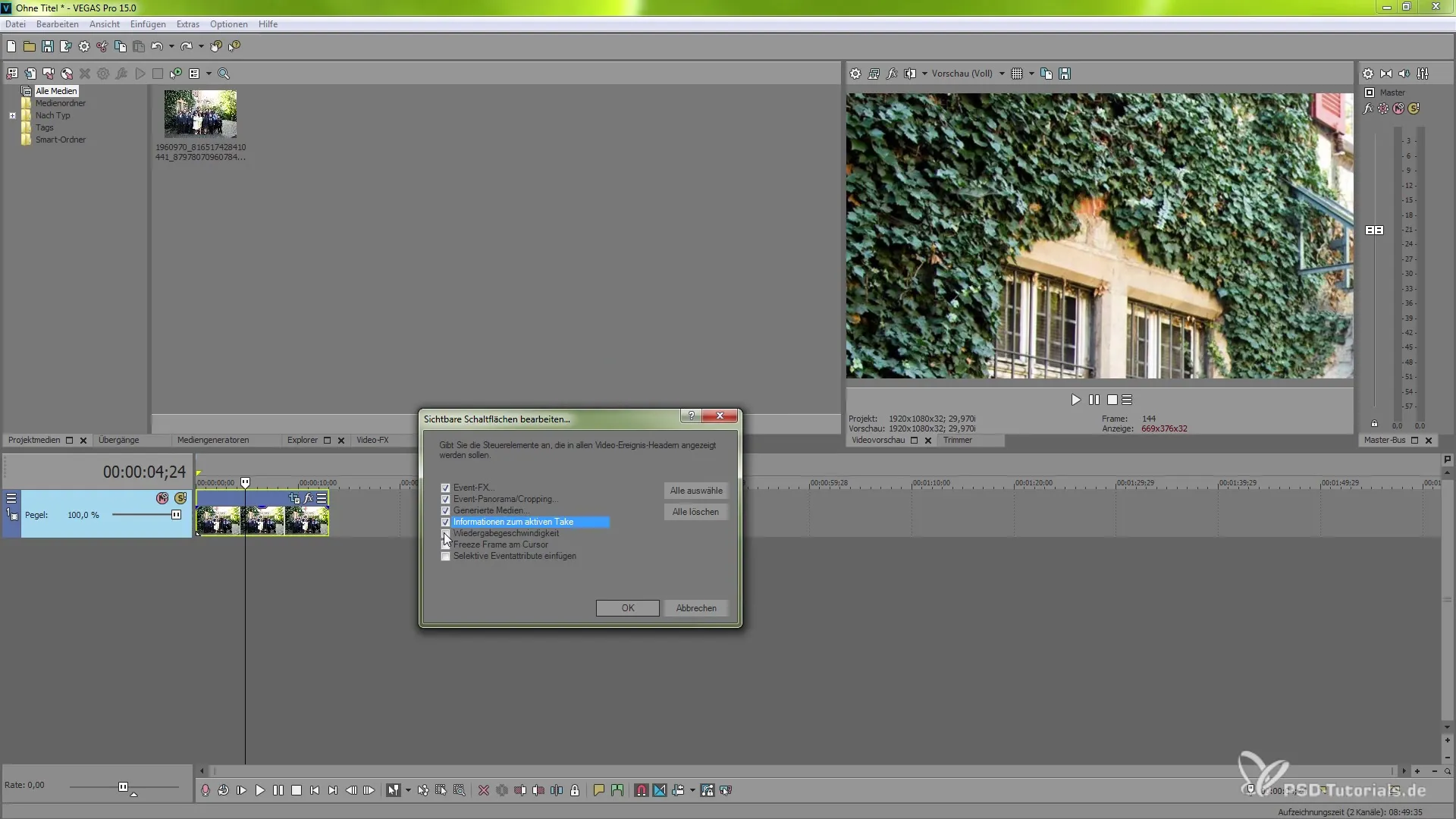Para personalizar aún más tu espacio de trabajo, puedes editar los botones visibles en el programa. En esta área, puedes activar o desactivar información sobre la toma activa, la velocidad de reproducción y los atributos de evento selectivos. Este proceso asegura que siempre mantengas un control sobre los ajustes importantes y que tu presentación no se sature.