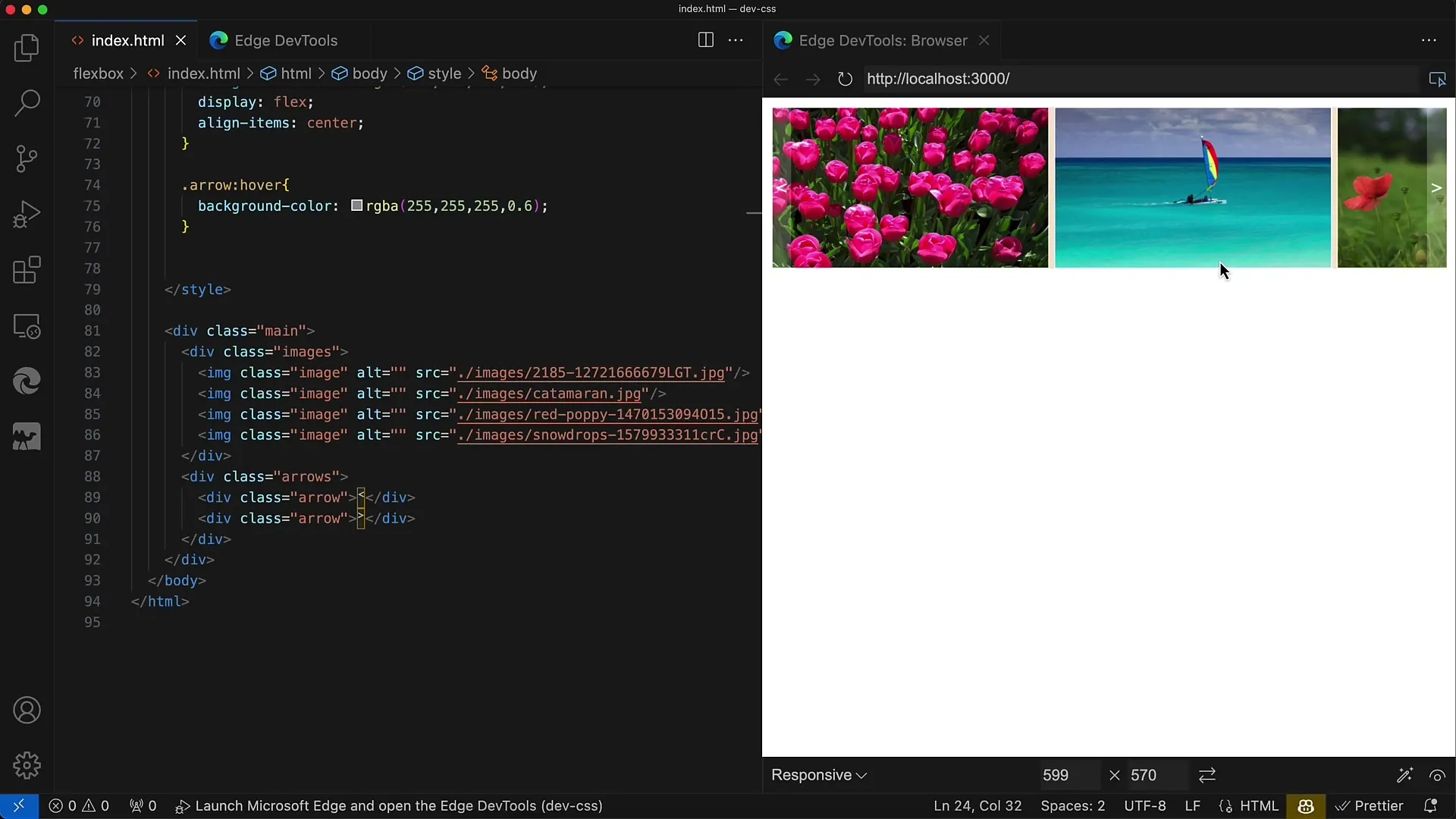 Ahora llegamos al contenedor de las flechas de navegación. Este contenedor también debe estar en position: absolute y mantener una altura y ancho del 100%, para que siempre se sitúe sobre las imágenes. Utiliza display: flex para alinear horizontalmente las flechas.