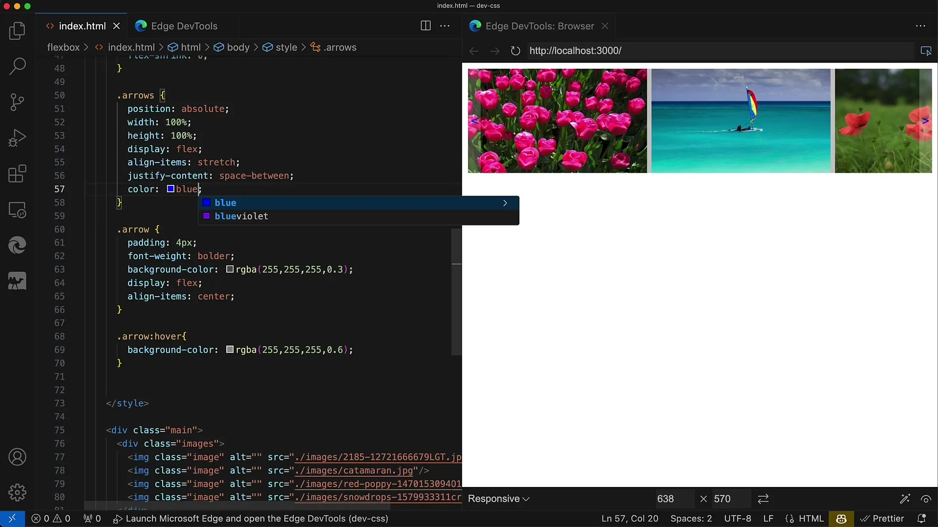 Coloca el contenedor de imágenes (.images) en position: absolute para que se superponga al contenedor de las flechas. Establece el ancho y la altura en 100% para que se coloque completamente dentro del contenedor principal. Además, utiliza las propiedades de Flexbox.