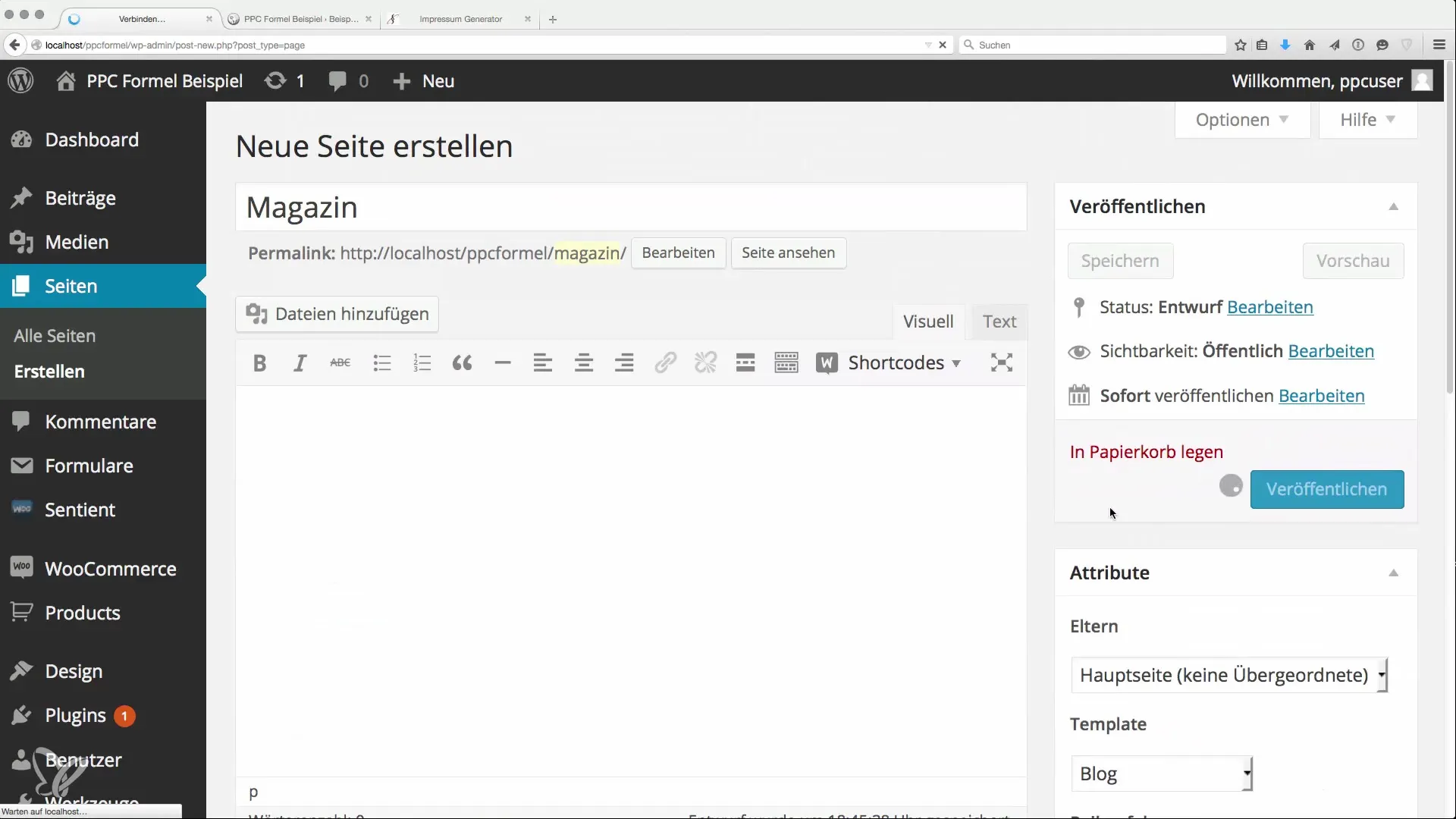 La siguiente página importante es la revista o el blog. Esta página no tendrá contenido estático, sino que listará artículos que publicarás a lo largo del tiempo. Para esto, selecciona en el backend la opción "Páginas" y luego "Crear" para una nueva página. Aquí elige la plantilla que corresponda a las entradas del blog.