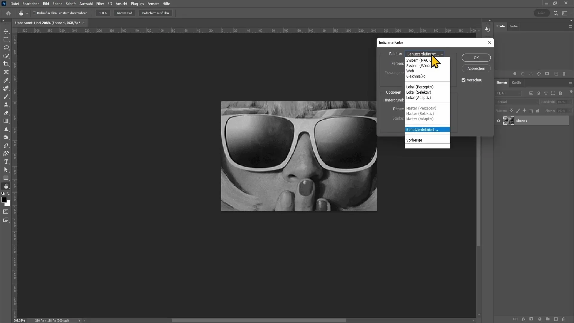 ¿Cómo puedo crear un efecto de dither en Photoshop?Debes ajustar el tamaño de la imagen, cambiar el modo a 'color indexado' y experimentar con diferentes paletas.