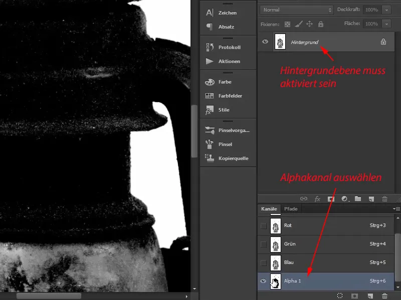 Ahora se encuentra en el canal alfa, que se ha creado porque ha creado un cálculo de canal. Esto significa que ha activado el fondo y no está en el canal RGB, rojo, verde o azul, sino en el canal alfa. Esto es muy importante.