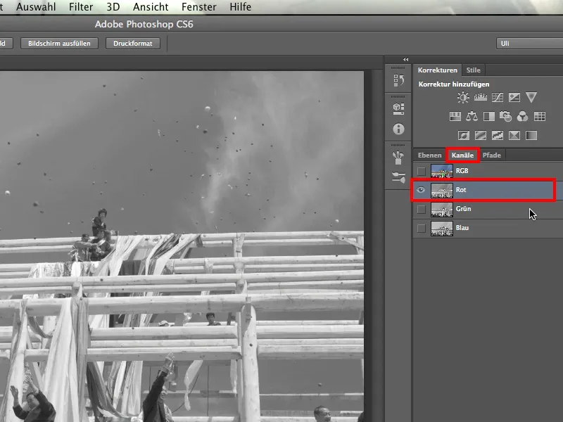 Para ello, paso a los canales y hago clic primero en el canal rojo. Ya podemos ver que el cielo azul aparece bastante oscuro y las vigas están bien resaltadas. Pero los chicos son bastante oscuros, incluso más que el cielo, mientras que los rayos son más claros que el cielo. Esto significa que el cielo está en medio y que el canal rojo se anula como canal de recorte.