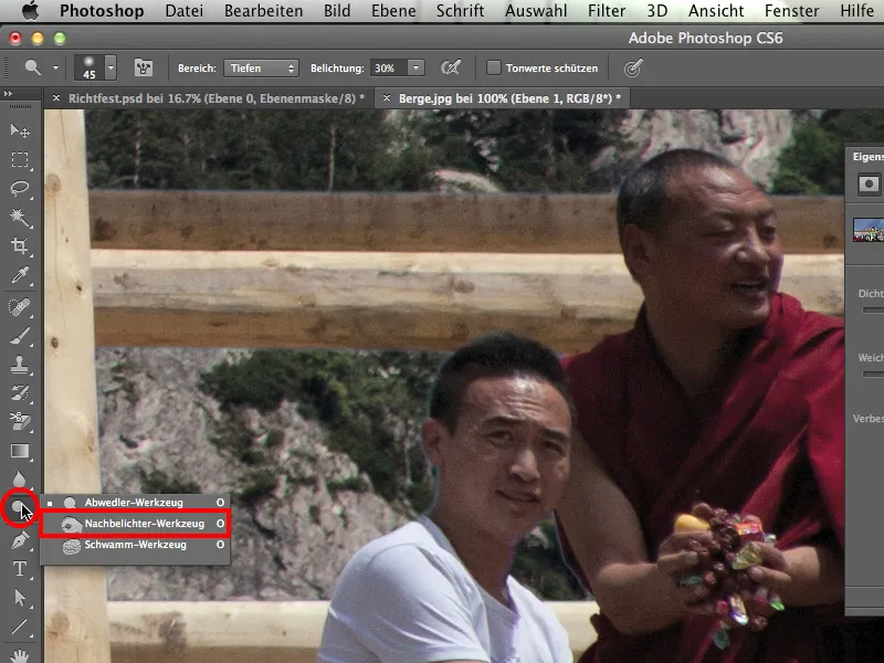 Para oscurecerlos, activo de nuevo la capa de la imagen, utilizo la herramienta de post-exposición y la hago bonita y pequeña.