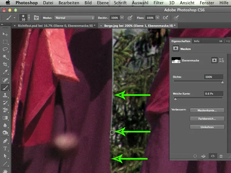 Hago clic en la máscara de capa y voy directamente a las propiedades. Creo que es suficiente con asignar un borde suave de unos 0,6px. Eso debería bastar para ajustar el borde aquí. Y efectivamente: ya tiene mejor aspecto. El primer plano y el fondo se acoplan mejor, por así decirlo.