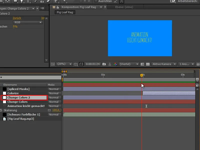 Así que borro de nuevo la capa duplicada y activo la capa "Cambiar colores". Luego seleccionamos todos los fotogramas clave dibujando un rectángulo sobre ellos.