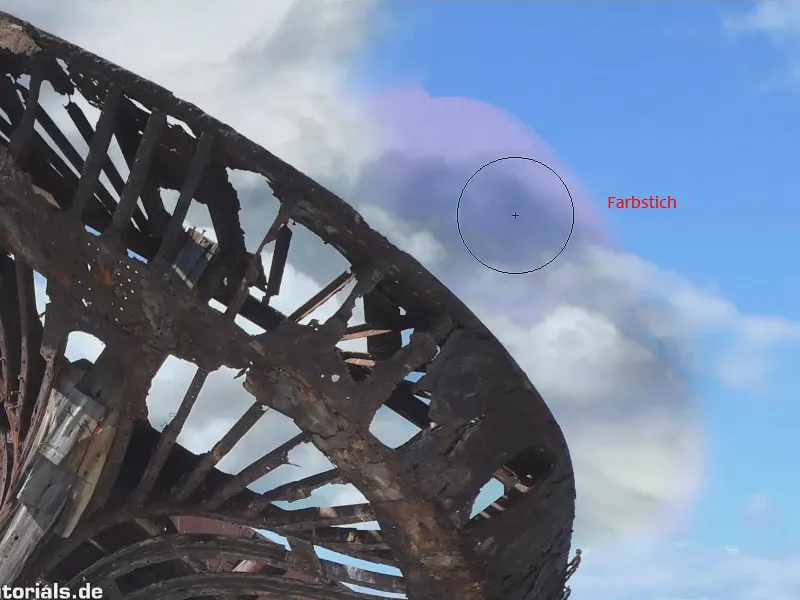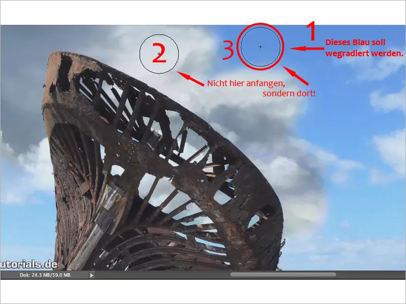 Esta es una de las cosas más importantes a tener en cuenta con esta herramienta. Imagina que quieres deshacerte del azul aquí arriba (1). Entonces bajo ninguna circunstancia debemos empezar aquí (2) en el blanco. Si aplico el pincel en este punto, recogerá el color que hay aquí debajo. Como ya no "ve" nada ahí, porque ya lo hemos borrado, tampoco puede reconocer el azul. Así que si queremos eliminar el azul en (1), tenemos que hacer clic exactamente en este azul (3), y entonces funciona perfectamente y podemos eliminar el azul..webp?tutkfid=58869)