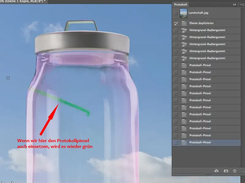He practicado esto antes para ver si funciona. Por eso ya puedes ver el símbolo del pincel aquí. Antes, la caja estaba vacía. Si está vacío, simplemente haga clic en este campo. Entonces, si ahora coges este pincel haciendo clic en la herramienta pincel de protocolo (2), puedes simplemente pintar sobre tu imagen y restaurar el estado del protocolo en este punto, es decir, antes de que se insertara el borrador de fondo.