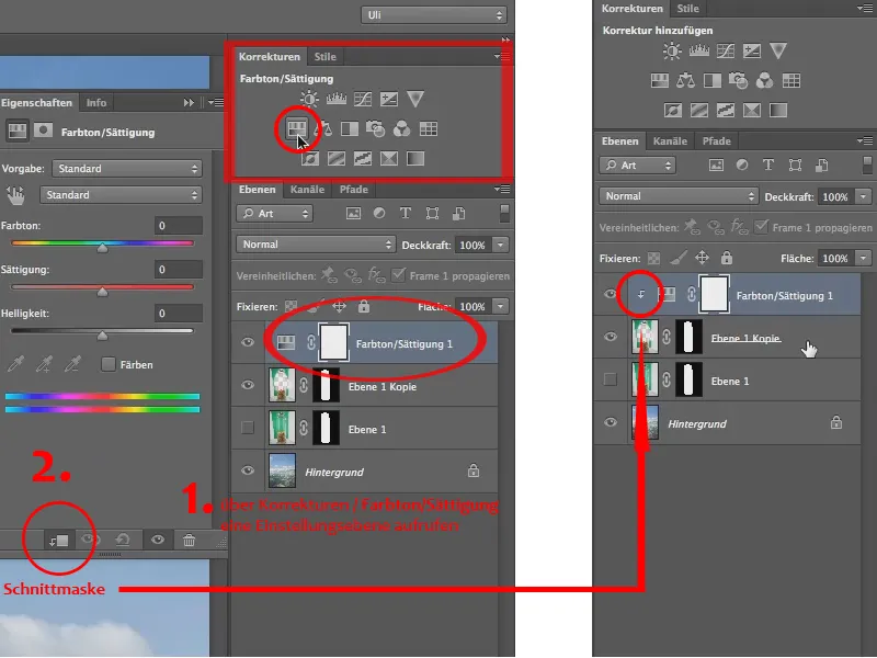 La establecemos como una máscara de recorte utilizando el icono en el panel Tono/Saturación (2) para que sólo afecte a la copia de este vaso de pasta aquí.