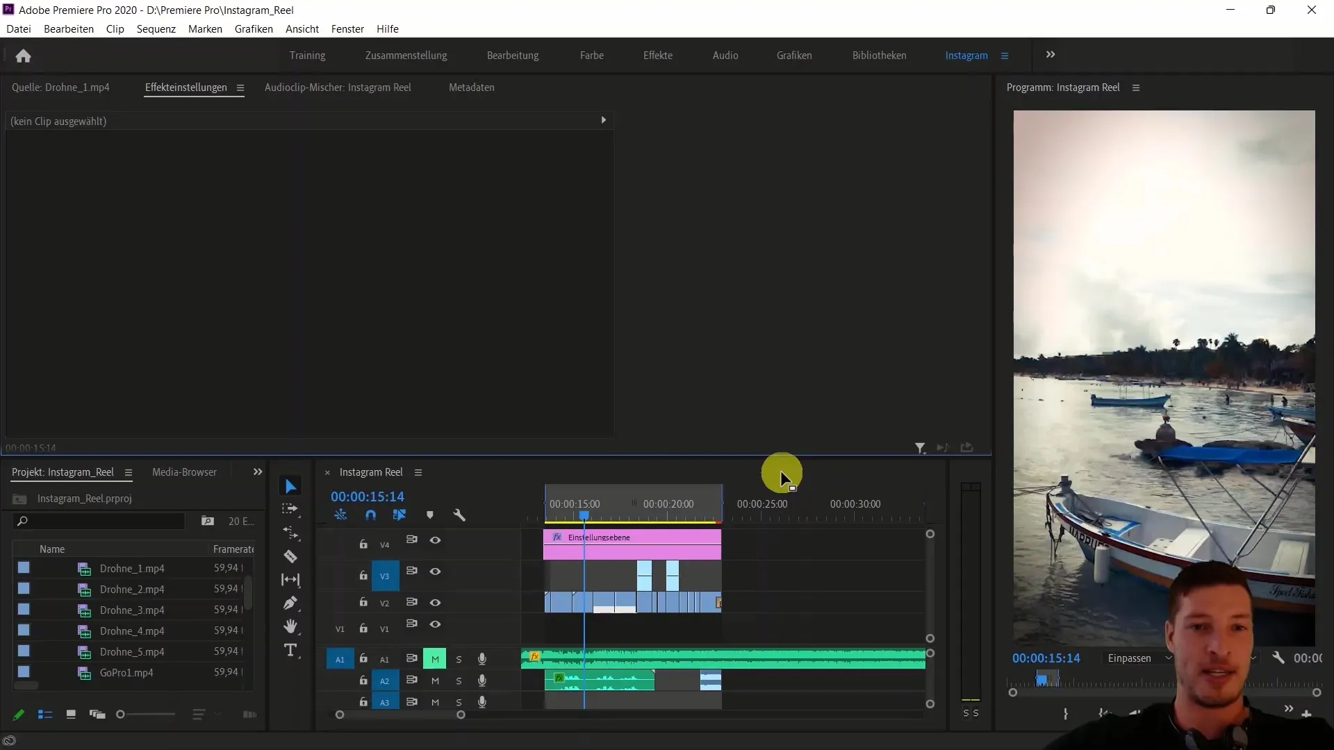 Luego, ve a tu secuencia de "Instagram Reel", posiciona la cabeza de reproducción en el lugar deseado y pega el clip allí presionando Ctrl + V (o Cmd + V). Es importante asegurarte de tener seleccionada la pista de vídeo correcta para que el clip se coloque correctamente en la secuencia.
