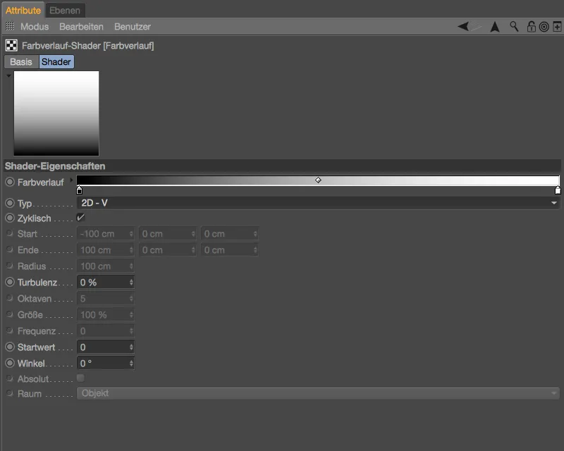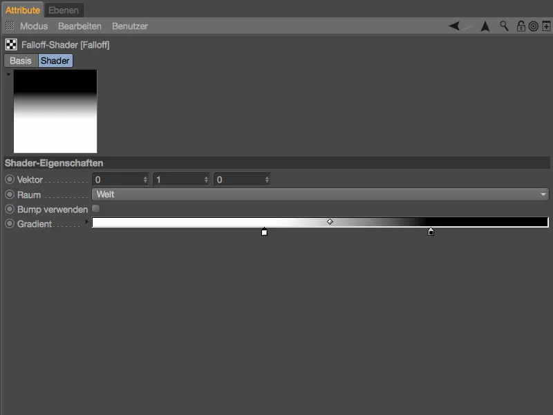 En el diálogo de ajustes del sombreador desvanecimiento, primero borramos los deslizadores de color no utilizados y creamos un gradiente de blanco a negro. Acercamos un poco los dos máximos para que las transiciones no sean demasiado largas o suaves.