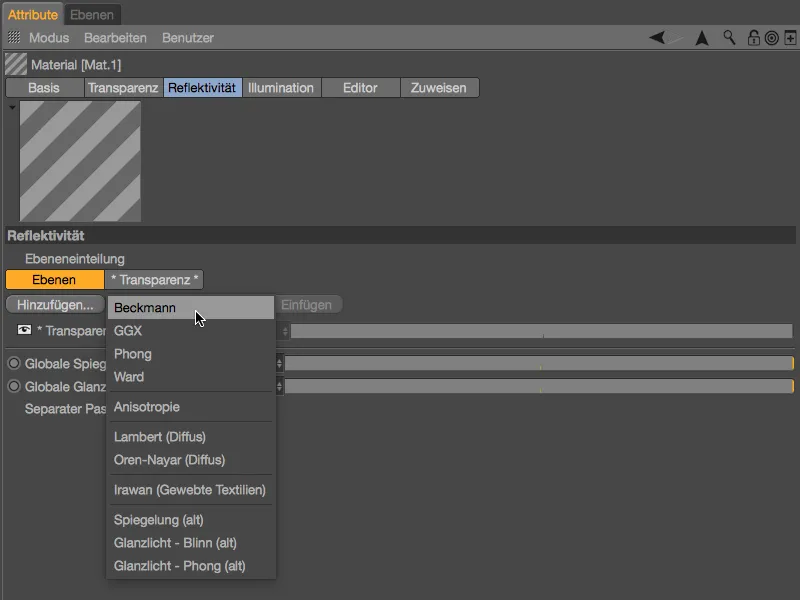 Sin embargo, este problema se soluciona rápidamente activando la opción Aditivo en el canal de transparencia. La transparencia se añade ahora a la información de color existente: nuestro sombreador de película fina permanece intacto y también es visible inmediatamente en la vista previa del material.