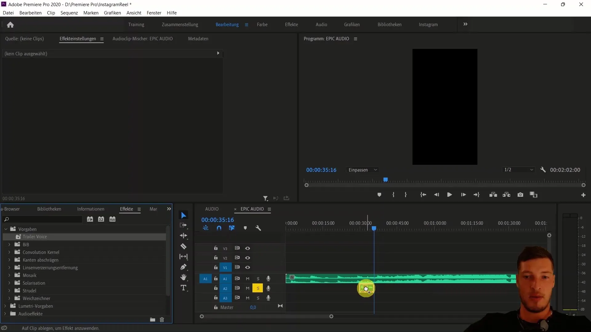 Para mostrar lo fácil que es aplicar el preset, importa una nueva pista que genere un estado de ánimo diferente. Crea una nueva secuencia y graba de nuevo una voz en off. Selecciona tu preset guardado de los efectos y añádelo a la nueva pista. De esta forma, puedes utilizar rápidamente y de manera efectiva tu voz de tráiler en diferentes proyectos.