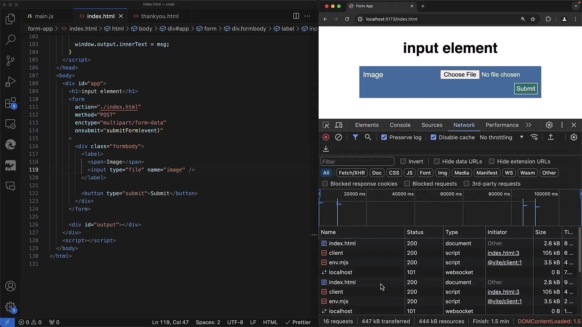 Aquí, en este ejemplo local, he configurado el elemento Input con el tipo "File". Verás que junto al botón aparece el texto "no file chosen". El elemento Input type="file" permite a los usuarios seleccionar uno o varios archivos, que luego se abrirán a través de un cuadro de diálogo de archivo nativo del sistema operativo.