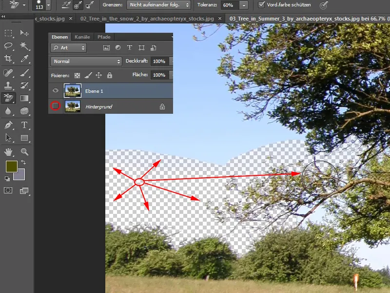 A continuación, simplemente selecciono de nuevo la herramienta de borrado de fondo , coloco la cruz reticular sobre el antiguo cielo y lo borro correctamente. Y todo vuelve a estar Schick.
