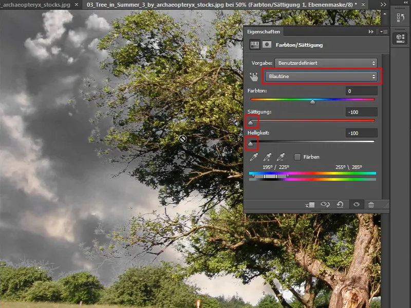 Ahora reduzco la saturación de la gama de colores que provoca las franjas de color. En este caso, se trata de los tonos azules. Para ello, sitúo el regulador de Saturación en -100 y reduzco al mismo tiempo el brillo.