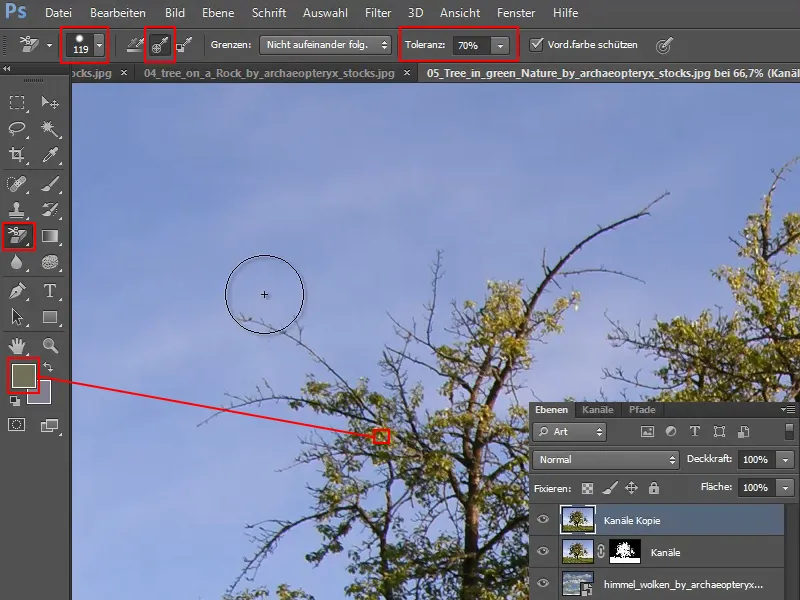 Esto significa que todo lo que ya ha sido recortado y es transparente ya no se cambia. Sólo me interesa la masa de píxeles que se muestra en el color equivocado. Por ejemplo, el verde de las ramas, que parece un poco musgo. Pero eso no es real y no lo quiero.