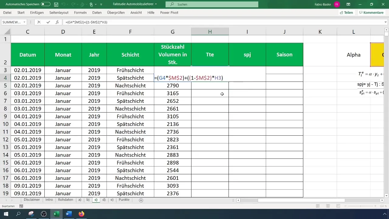 Ahora, que necesitas los valores estacionales, comienza tomando las primeras observaciones y realizando los cálculos de los valores estacionales a partir del cuarto punto, multiplicando las fluctuaciones anteriores por el Alfa y un valor de Gegen-Alpha (1 - Alfa). Asegúrate de fijar adecuadamente las fórmulas antes de copiarlas para obtener los resultados de los puntos siguientes.