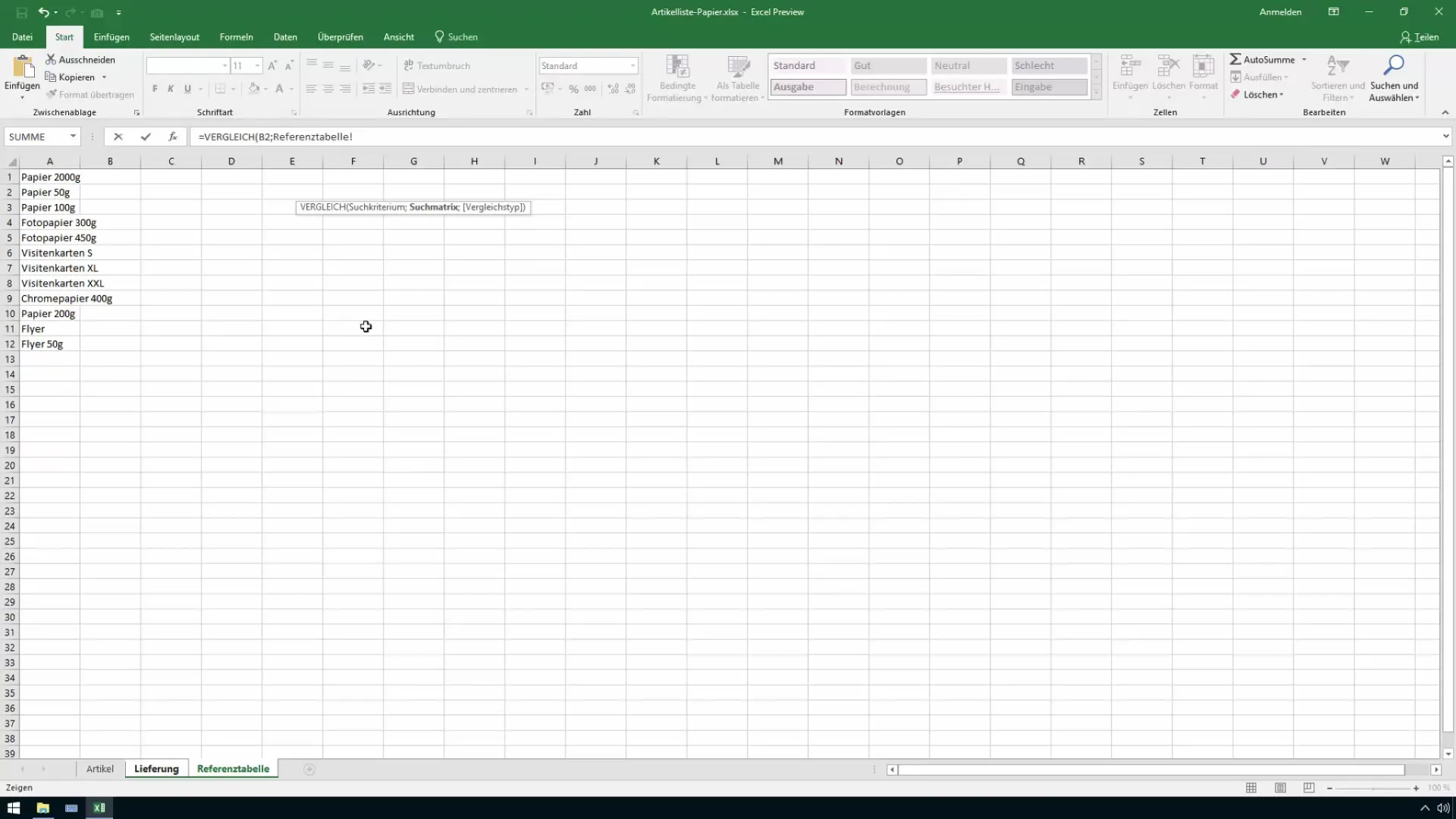 Ahora es momento de crear la fórmula de comparación. Inserta en la celda donde deseas ver el resultado de la comparación la fórmula =VERGLEICH(Criterio_buscado;Matriz_de_búsqueda;Tipo_de_comparación). El criterio de búsqueda es el artículo que estás buscando. En nuestro caso, podría ser un papel específico como "Papel 200 g".