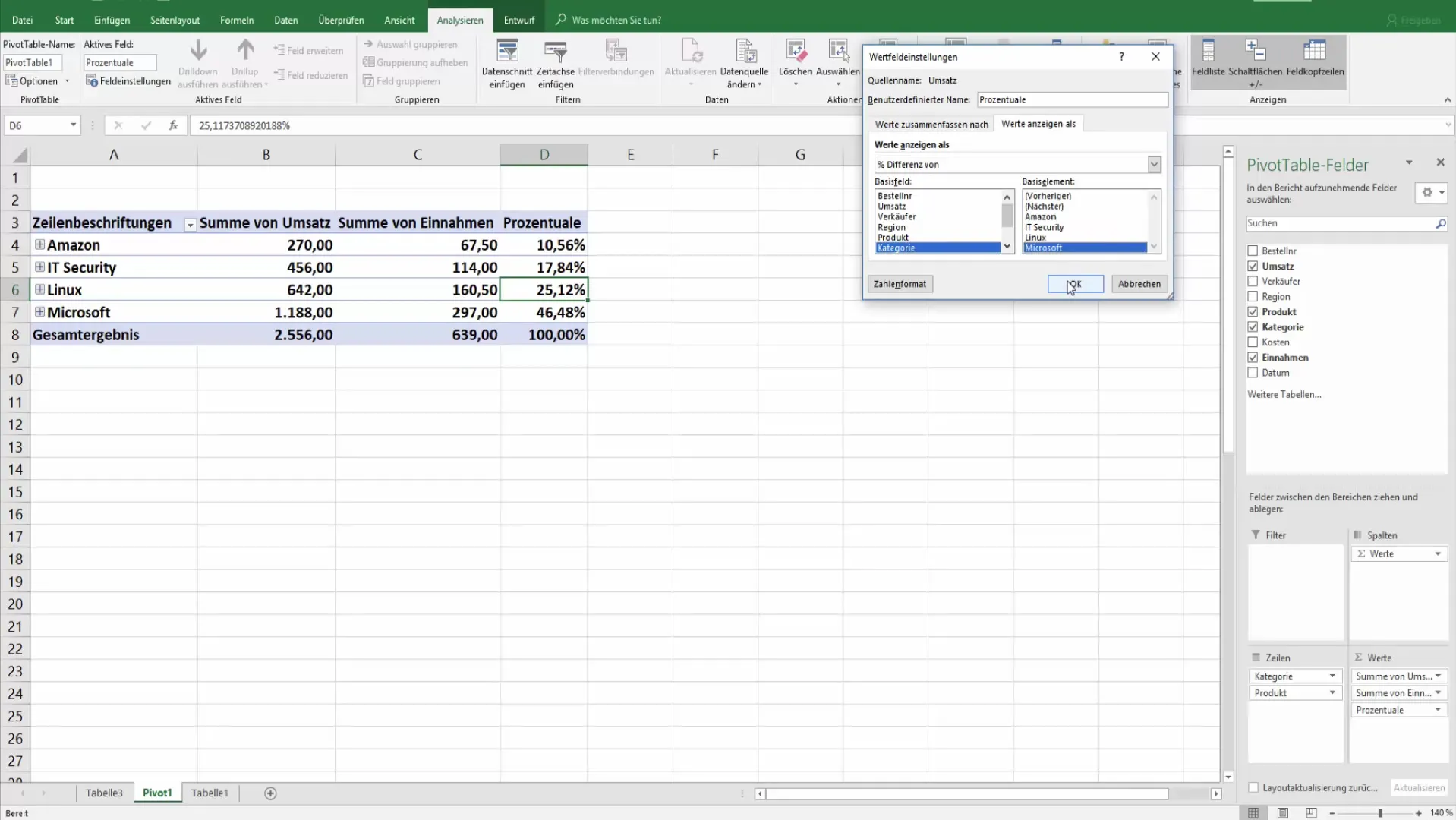 Además de la suma de ingresos, también puedes calcular el porcentaje. Arrastra nuevamente los ingresos a la tabla de valores y cambia las configuraciones de campo para mostrar el porcentaje del resultado total.