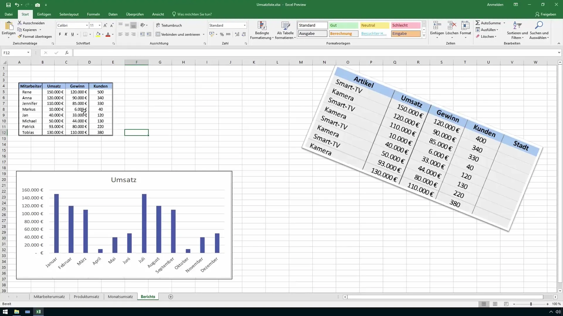 Comienza abriendo el archivo Umsatzliste.xlsx. En primer lugar, crea un pequeño gráfico SmartArt a partir de los diversos ingresos. Navega hasta la zona del archivo donde se encuentran tus datos de ingresos.